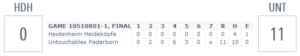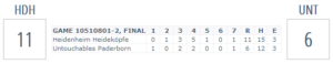 Das entscheidende dritte Spiel war ebenfalls aufregend, endete jedoch mit einem 6:11 für die Heideköpfe. Steffen Dembowski konnte in 2.1 Innings 4 Punkte nicht verhindern und musste den Loss hinnehmen. Benjamin Thaqi folgte ihm und ließ in 1.1 Innings 5 Runs zu. Nicolas Göbert trat als dritter Pitcher auf und hielt die Gegner in 3.1 Innings auf nur 2 Punkte. Auf der Hitterseite überzeugten Sho Usui mit 3 Hits und Luca Rammelmann mit 2 Hits.