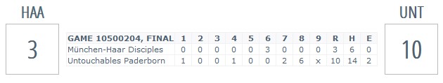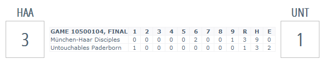 Das Spiel begann vielversprechend für die Untouchables mit einem Punkt im ersten Inning. Der Starting Pitcher der Münchener kämpfte mit Kontrollproblemen, konnte sich aber bei Bases Loaded mit nur einem 1:0-Rückstand aus dem Inning retten. Trotz der frühen Führung und acht Schlagmännern im ersten Inning gelang es den Untouchables nicht, weiter zu punkten. Im sechsten Inning konterten die Haarer und gingen mit zwei Punkten in Führung, die sie bis zum neunten Inning auf 3:1 ausbauten.