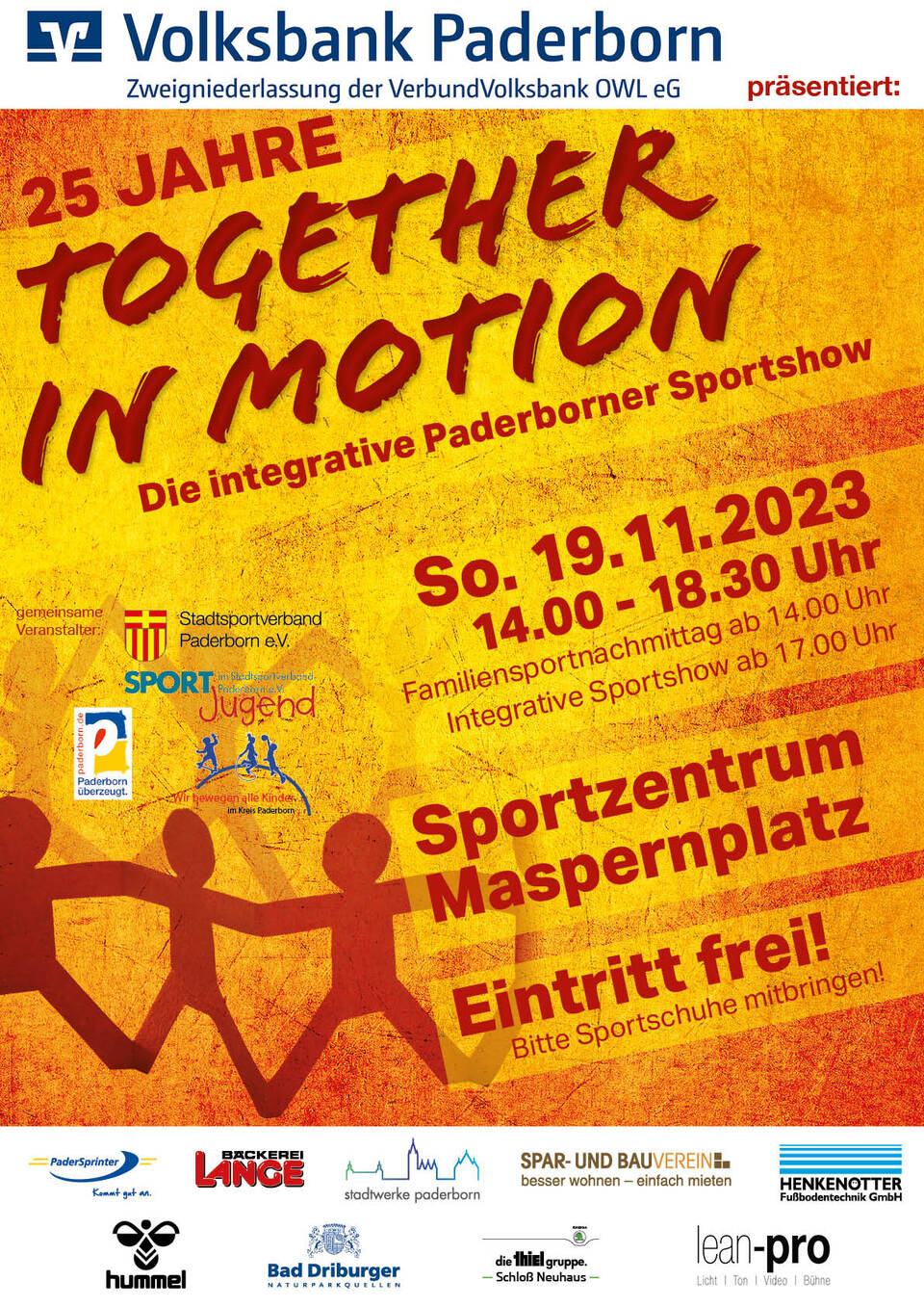 Ein Fest für alle sportbegeisterten Paderborner Familien kündigt sich an. Die Ausgabe zum 25-jährigen Jubiläum des Integrativen Sportfestes "Together in Motion" findet am 19. November 2023 von 14:00 bis 18:30 Uhr im Sportzentrum Maspernplatz statt. Traditionell wird dieses von der Volksbank Paderborn präsentiert.