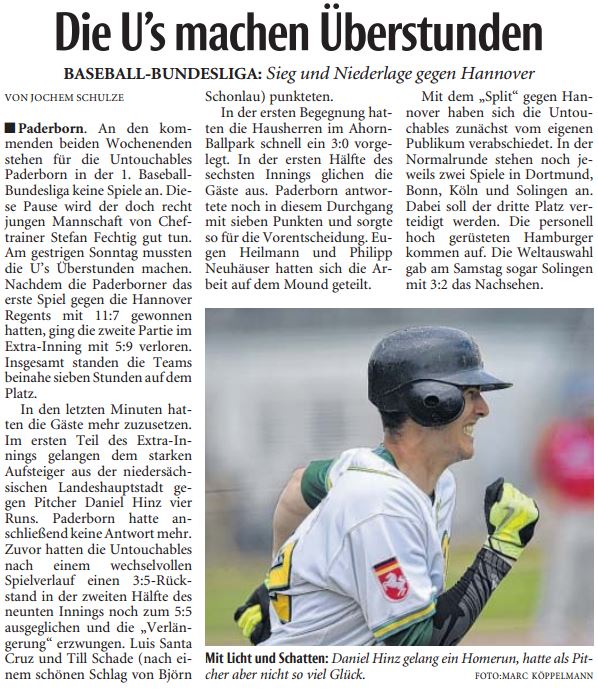 Neue Westfälische vom 15. Juni 2015 15. Juni 2015 Baseball-Bundesliga: Sieg und Niederlage gegen Hannover