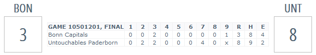 Bonn konnte im neunten Inning noch einmal auf 8:3 verkürzen, doch Paderborns Pitcher Steffen Dembowski ließ nichts mehr anbrennen und beendete das Spiel.