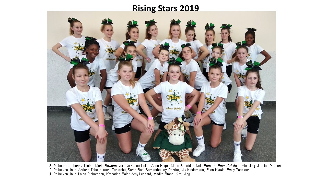 Auch dieses Team unterstützt die Jugend- und Bundesligamannschaft der Untouchables bei Heimspielen, motiviert und voller Freude. An den wärmeren Tagen des Jahres trifft man sie auf Sport- und Stadtfesten. An den kälteren Tagen sind sie jedoch nicht untätig, hier sieht man sie unter anderem beim Kinderkarneval oder auch Karnevalsumzügen. Zudem nehmen die Rising Stars an Regional- oder verbandsunabhängigen Meisterschaften teil. Hier konnten sie schon einige gute Plätze ergattern, zuletzt den 3ten Platz im Dezember 2019.