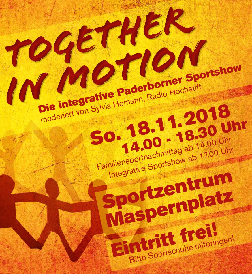 Bei „Together in motion“ – Die integrative Paderborner Sportshow mit Familiensportnachmittag – können alle Paderbornerinnen und Paderborner aktiv und passiv einen sportlichen Hochgenuss erleben. Traditionell wird diese Veranstaltung von der Volksbank Paderborn präsentiert und bereits zum 21. Mal vom Stadtsportverband Paderborn, vom Verein Wir bewegen alle Kinder im Kreis Paderborn, von der Sportjugend Paderborn und vom Paderborner Sportservice ausgerichtet.