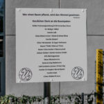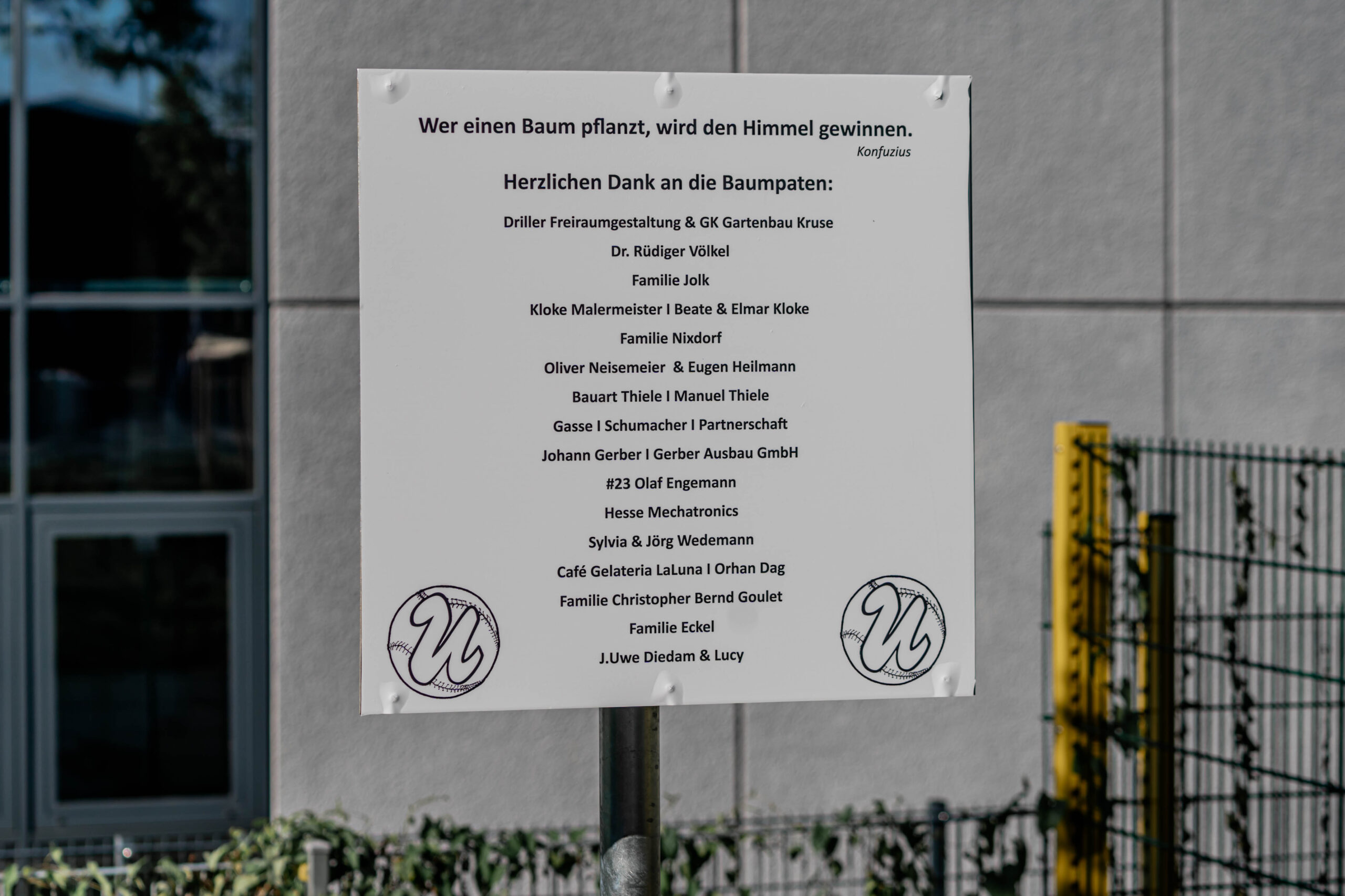Beitrag zur Artenvielfalt und Biodiversität darstellt. Nur konsequent, dass der Verein sich dazu entschieden hat, auch entlang des neu entstandenen Fahrradwegs hochstämmige Bäume zu pflanzen. Die Lücke, die wir in den grünen Rahmen unseres Ahorn-Ballpark gerissen haben, sollte wieder gefüllt werden. Aber leider war unser Baubudget schon arg überstrapaziert und wir hatten wirklich keinen Spielraum mehr für solche Anpflanzmaßnahmen. Da entstand die Idee der Baumpatenschaften, so der Finanzvorstand der Us Christopher Goulet. Die Idee hat schnell gezündet, denn jeder Baumpate konnte sich mit einem schönen Spruch oder auch Wunsch auf einer Tafel neben seinem Baum verewigen. Die 16 Bäume, deren Leben im Normallfall das der Paten überdauert, hinterlassen so eine ganz individuelle Botschaft an die Menschen, an den Ort und auch den Verein. Mit etwas Muße, wird so der Fußweg zu einem einzigartig literarischem Erlebnis. Selbstverständlich haben wir uns für Ahorn-Bäume entschieden, die sich im Herbst, am Ende unserer Saison, in Vereinsfarben von grün ins gelb verfärben. Im Frühjahr kündigen dann 1500 gelb blühende Narzissen den Start der neuen Saison an, so J.Uwe Diedam. Bei einer kleinen Feierstunde dankte der Vorstandsvorsitzende den Paten und zitierte dabei Konfuzius mit den Worten: Wer einen Baum pflanzt, wird den Himmel gewinnen.