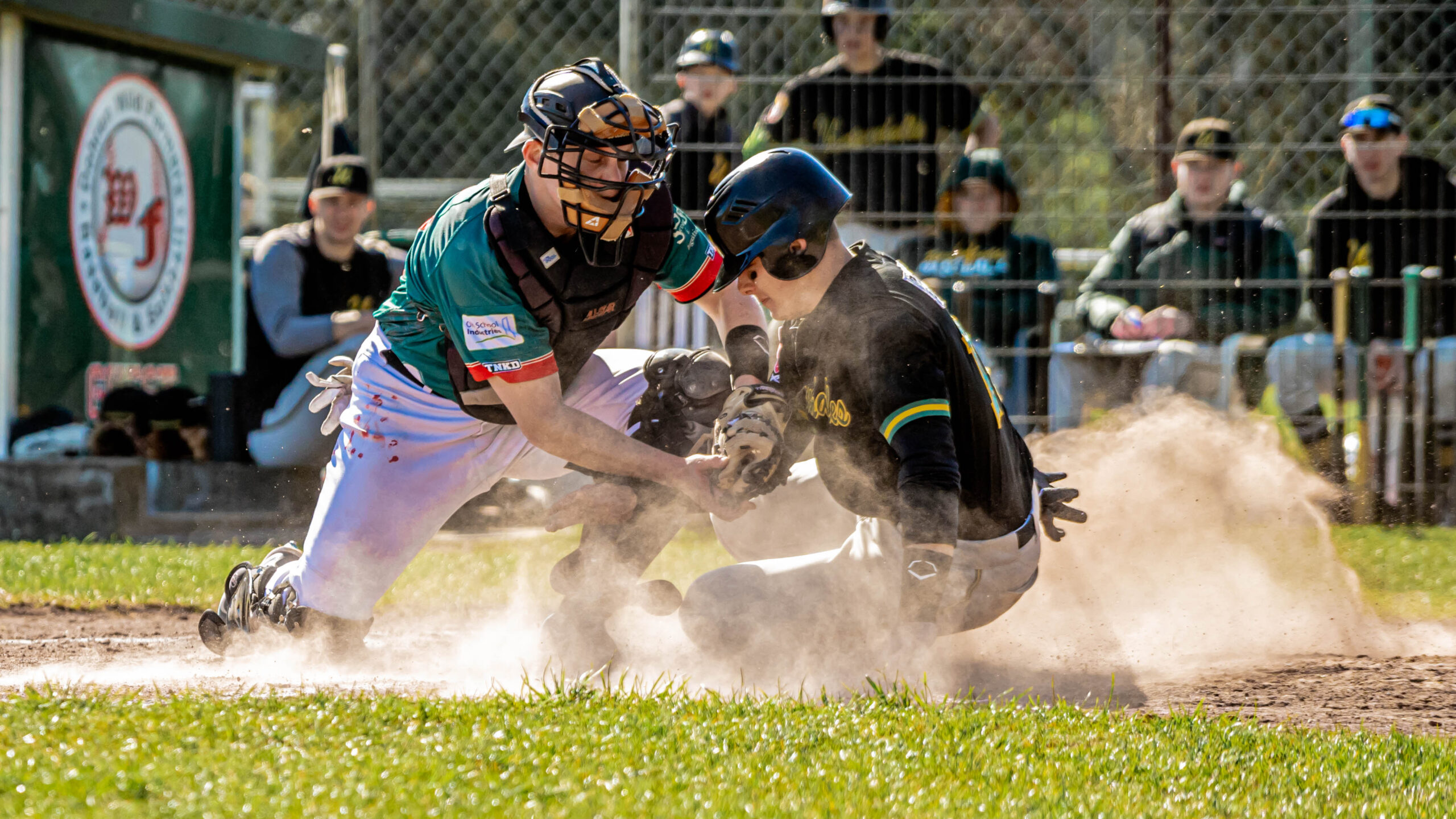 Mark Harrison begann das Spiel auf dem Mound und kämpfte sich mit seinem „B-Stuff“ durch 3.1 IP, geriet aber im vierten Inning in Schwierigkeiten. Nach 2 Walks und einem Sacrifice Bunt löste Benjamin Thaqi Harrison ab. Unser Thaqi zeigte einmal mehr, warum er zu den Besten der Liga gehört, indem er einen Groundball zu Finn Bergmann an der dritten Base erzwang, der den Ball aufnahm, ihn zum Aus nach Hause schoss und Maurice Bendrien den Ball schnell zur ersten Base warf, um das Inning mit einem Double Play zu beenden!