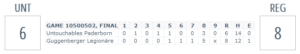 Im siebten Inning schlugen die Untouchables erneut zu: Ein RBI-Double von Luca Rammelmann und ein 2-Run-Homerun von Nadir Ljatifi brachten die Gäste mit 6:3 in Führung. Doch die Legionäre nutzten ihren Heimvorteil und eine starke offensive Leistung, um fünf Runs zu erzielen und das Spiel letztendlich mit 8:6 für sich zu entscheiden.