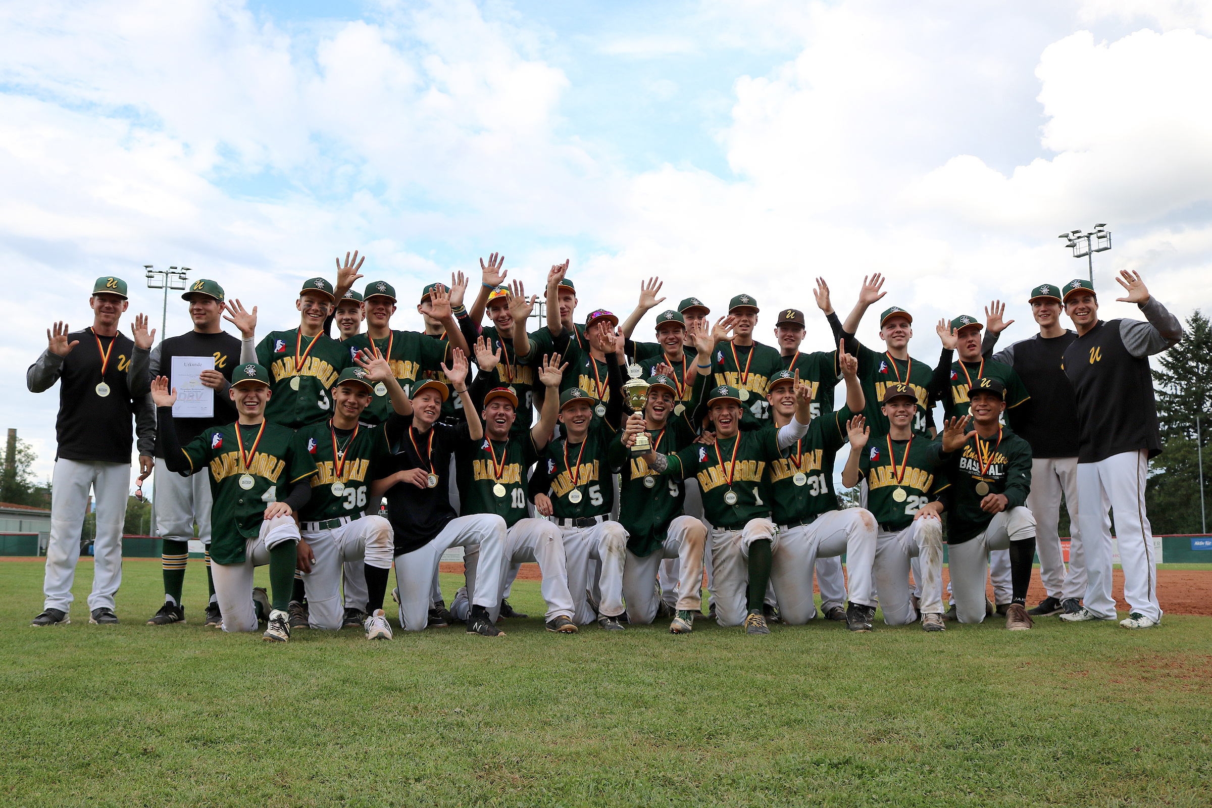 Direkt im ersten Spiel am Samstag fegten die Untouchables Paderborn die Heidenheim Heideköpfe mit 20:0 vom Platz. Ein sehr gelungener Auftakt. Mit bester Laune ging es in Spiel zwei gegen den Ausrichter Mainz Athletics. Dort siegten die U’s mit 08:03 und hatten den Gruppensieg so gut wie sicher. Am Abend folgte das dritte Gruppenspiel gegen die Holm Westend 69ers. Dieses Spiel konnte auch sehr deutlich mit 18:3 gewonnen werden. Der Gruppensieg gehörte somit den Untouchables. Als Erstplatzierter der Gruppe B trafen die U’s auf den Zweiten aus der Gruppe A, die Bad Homburg Hornets. Sie erwiesen sich zunächst als starker Halbfinalgegner, bis Finn Bergmann mit einem 2 Punkte Homerun die Offensive der Untouchables ins Rollen brachte. Nennenswert war auch das starke Pitching von Nicolas Göbert, der die Hornets bei nur einem Punkt in dem 9:1 Erfolg hielt. Die Weichen waren gestellt und im Finale wartete der Meister der vorgegangenen 4 Jahre – Regensburg. Paderborn und Regensburg haben beide sehr gute Sportinternat-Programme und leisten eine hervorragende Nachwuchsarbeit. Doch in den letzten Jahren hatte Regensburg immer die Nase zum Teil deutlich vorn. Mit sehr guter Laune und dem Spaß am Spiel wuchs die Mannschaft von Bundesligaspieler Till Schade zusammen, sodass unsere Paderborner nicht mehr zu stoppen waren. Mark Harrison auf den Werferhügel für die Untouchables gegen Niklas Rimmel auf Seiten der Legionäre. Ein Duell wie es im Buche steht. Bis ins vierte Inning stand es 00:00, doch dann hatte Niklas Rimmel ein paar Probleme. Durch ein Double von Zan Primozic  kamen zwei Punkte rein. Während Mark Harrison ein super Spiel auf dem Hügel warf, half ihm seine Defensive ungemein. Ganze 4 Double Plays konnten Paderborn machen. Einen großen Anteil daran hatte Marco Cardoso, der unlämgst einen Profivertrag bei den Boston Red Sox unterschrieben hatte. Florian Seidel machte es perfekt und sorgte für das letzte Aus im 7. Inning.