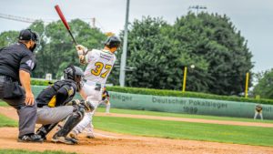 Die Gäste aus Bonn kamen besser in das Topspiel und gingen bis ins 5. Inning mit 5:0 in Führung. Starting Pitcher Mark Harrison kam schwer ins Spiel rein, kam aber jedes Mal mit einem blauen Auge aus den Innings raus. In der Offensive gelangen den U’s einige Hits aber auf das Scoreboard kam erst im 8. Inning der erste Run. Insgesamt schlugen die Spieler von Jendrick Speer 11 Hits. Im 9. Inning verkürzten die Untouchables noch einmal auf 2:5 aber mehr war im ersten Spiel dann nicht drin.