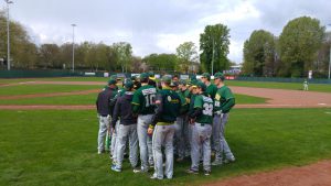 Mit dem guten Momentum auf unserer Seite war die Aufholjagd eröffnet, welche leider nur zwei Batter später ein nasses Ende fand, als sich die Wolken über Dortmund öffneten und der April sich von seiner besten Seite zeigte. Während der langwierigen Regenpause gab es alles zu sehen, von Regen bis Hagel mit eisigem Wind. Das Spiel schien schon verloren, da schlug das Wetter tatsächlich um. Kalt war es immer noch, aber wenigstens trocken und so hieß es nach knapp 50 Minuten wieder „Los geht’s!“.